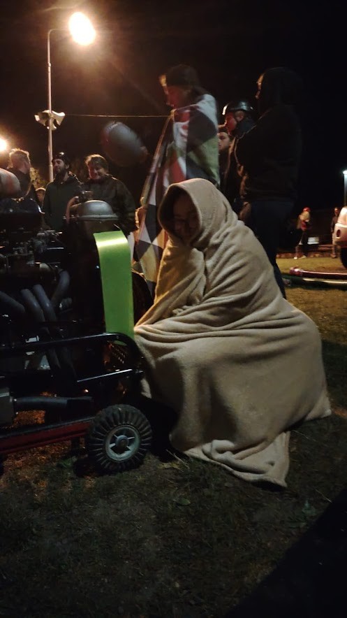 Za zmínku stojí i naše taneční kreace mezi pokusy. Kdo se zastavil, musel být buď hodně oblečen, nebo zabalen do dek. Takže jsme do rytmu hudby rozpohybovali nejen svá těla, ale i sousedy, rozhodčí a komentátora. Byla to sice studená noc, ale jinak velmi příjemný zážitek celé party/ celého týmu.