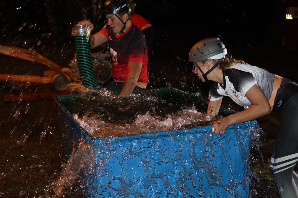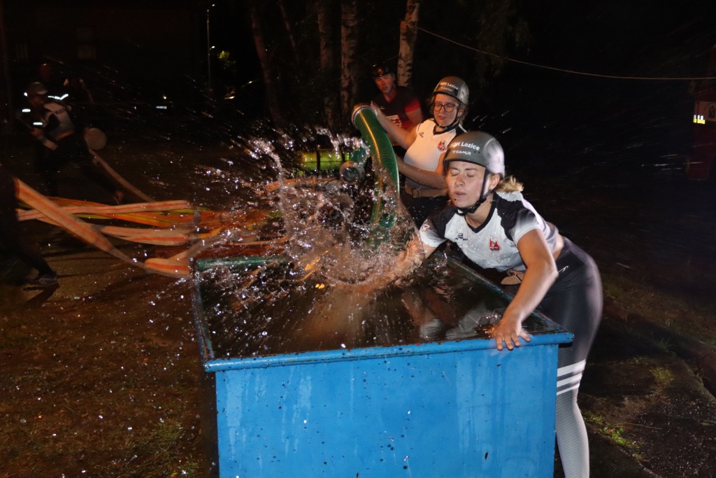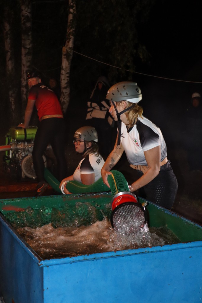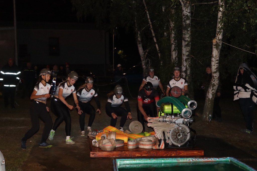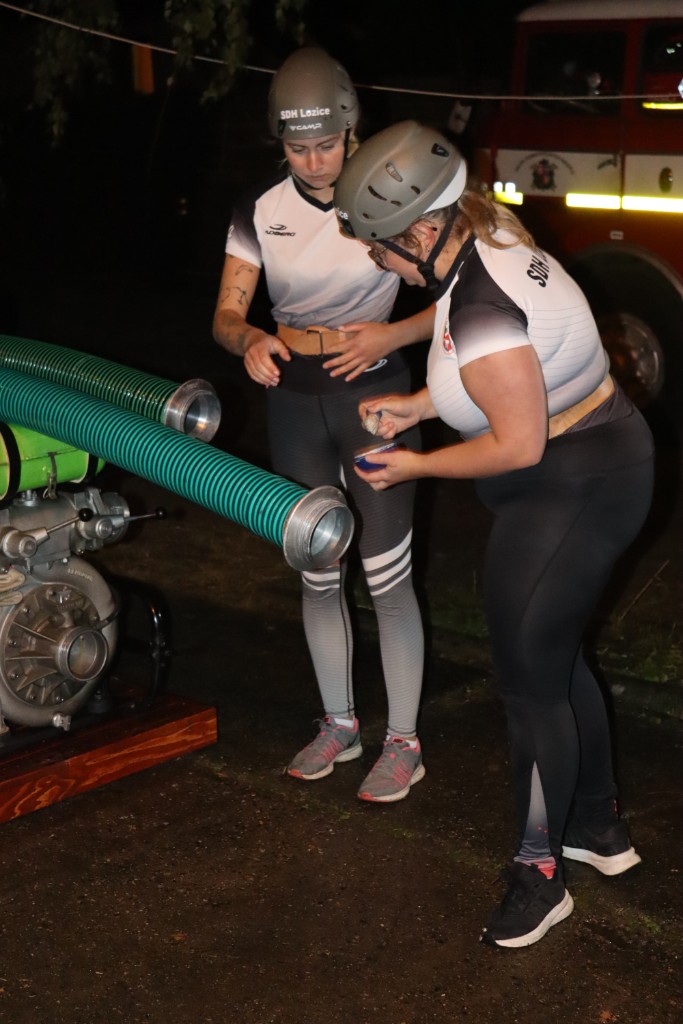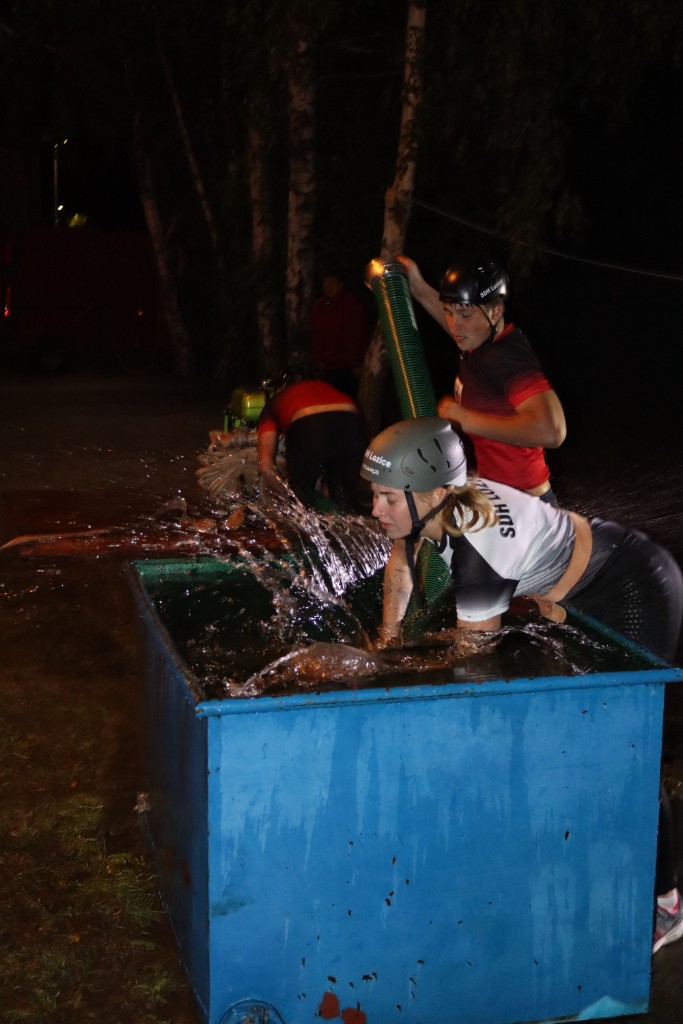 První šli na řadu ženy. Boj byl se jen svléknout do triček. A představa koupání se ve vodě tomu moc nepomohla. Ale.....holky se hecly a už čekají na startu.... výstřel... vše nasazeno, jen Martě se do té vody prostě nechtělo. Hance nepustila savec a ta byla krátká. Aleš na stroji se snažil, co to šlo. Téra na béčkách, Míša na děliči to tlačili i "vočima" a Viky s Géčkem na hrotu měli nastříkáno cobydup. Čas 36s nás ale neuspokojil. Jo druhý, to bylo jiný kafe. 31s a nádherné 2. místo. Paráda.